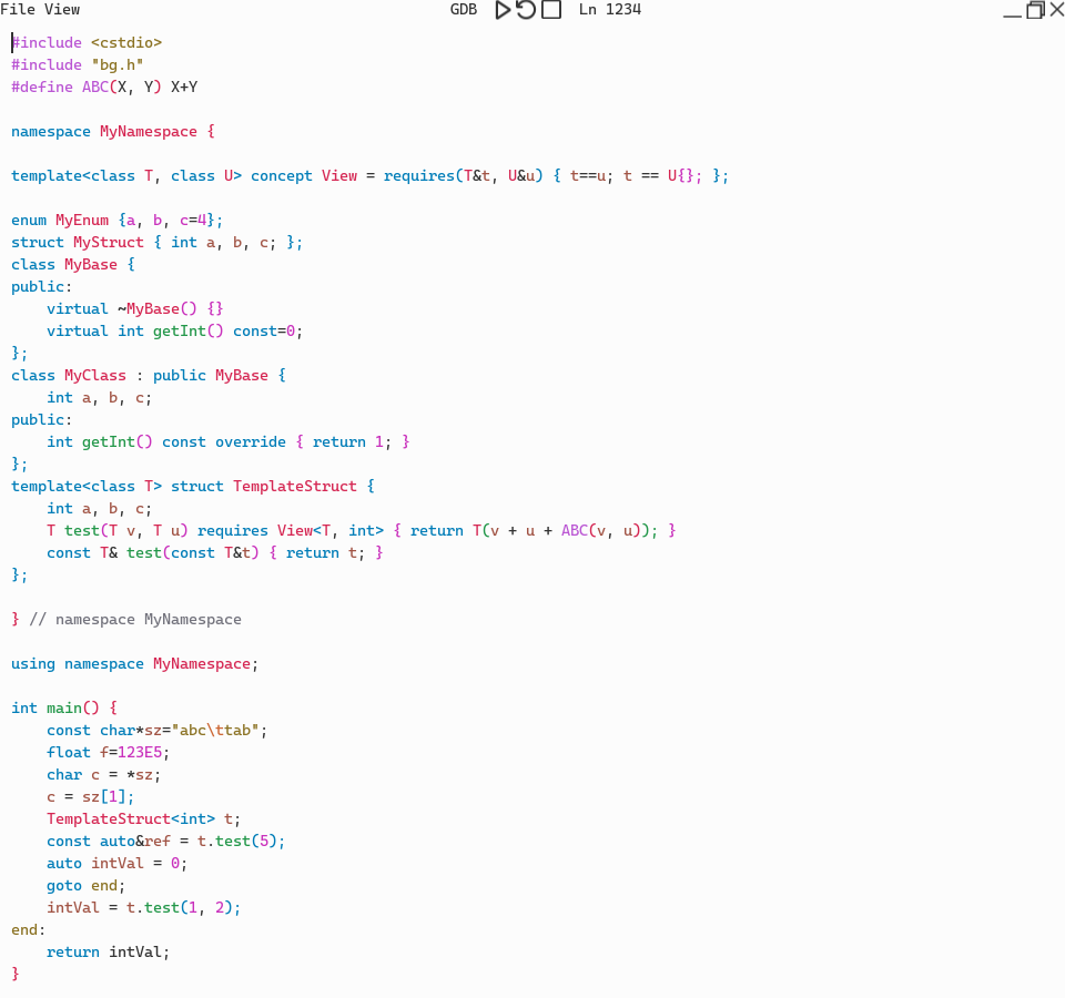Immediately after the LSP code, I wrote syntax highlighting. LSPs generally expect the editor to handle simple things, such as keywords, strings, and comments. This wasn't too hard, but it takes work to mix the syntax highlights and the LSP semantic tokens together. LSP servers don't just give you the tokens; they give you a legend required to decode the tokens. The legend can be dynamically generated, so you can't assume anything, and may contain things not part of the official spec. There's a lot more to handle in the future (stale data, files modified outside of the editor, etc), but this is a good start.